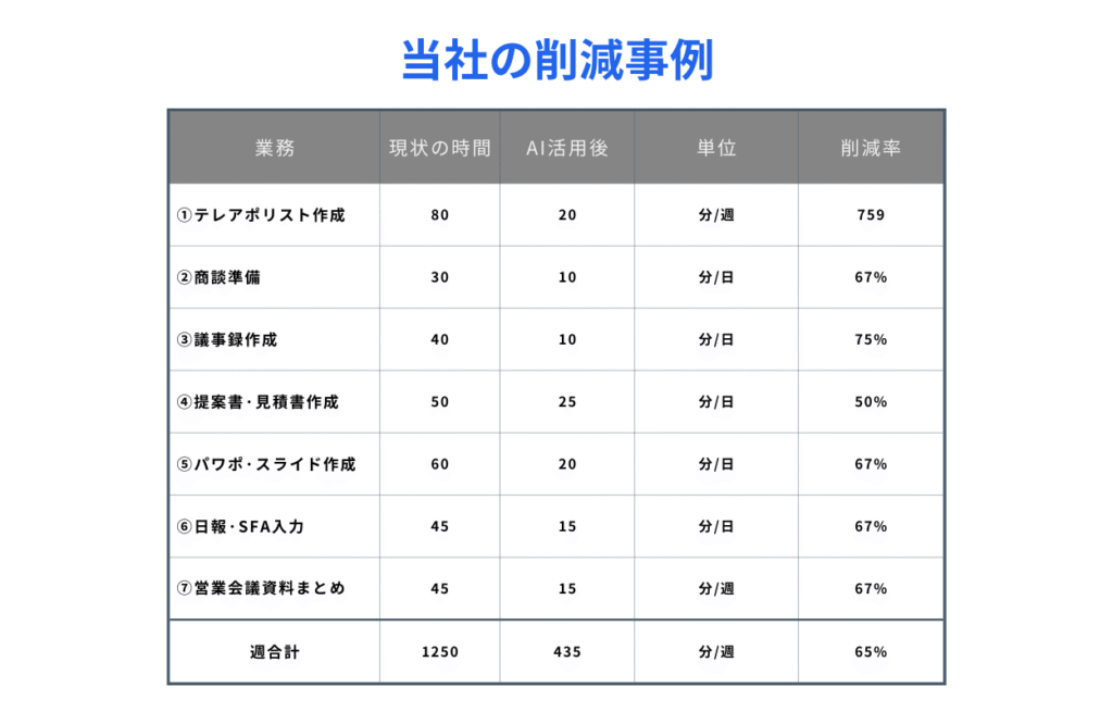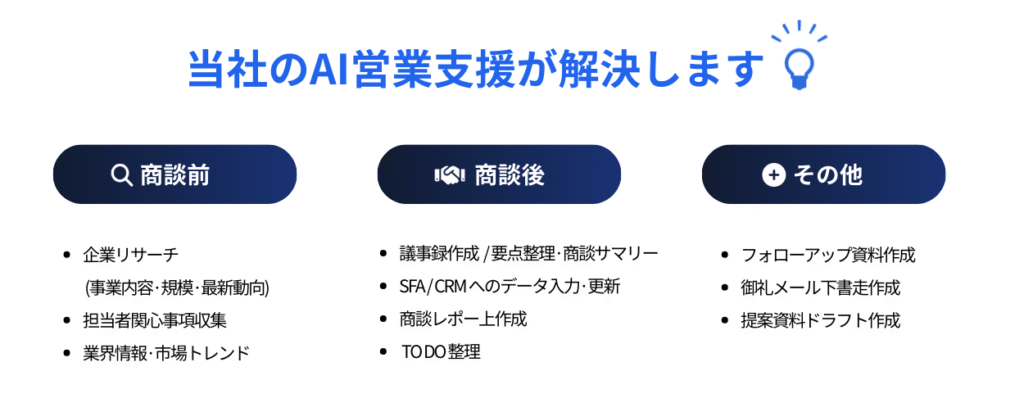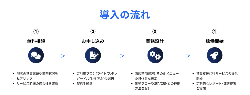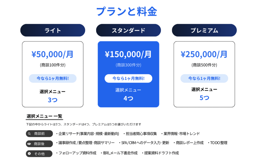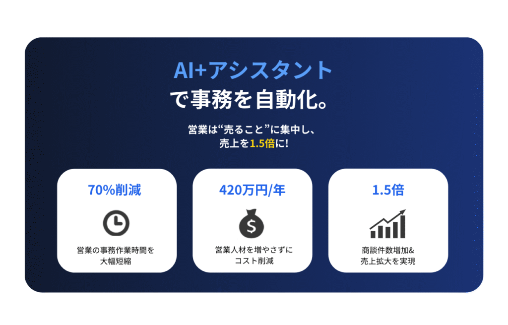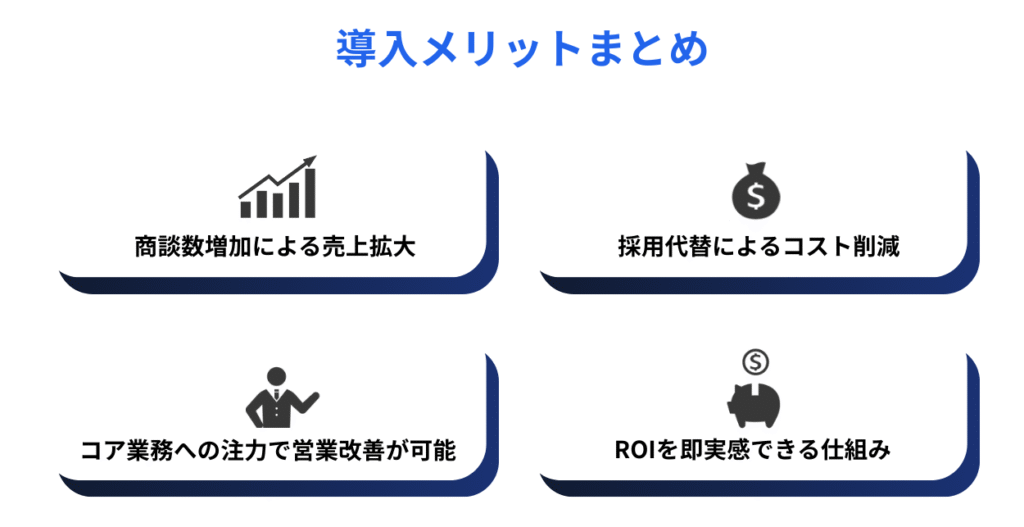 A:営業人材を新規採用すると年600万円程度のコストがかかります。当社サービスでは、スタンダードプラン(15万円/月)=180万円/年 で同等の成果が得られ、年間420万円のコスト削減 が可能です。